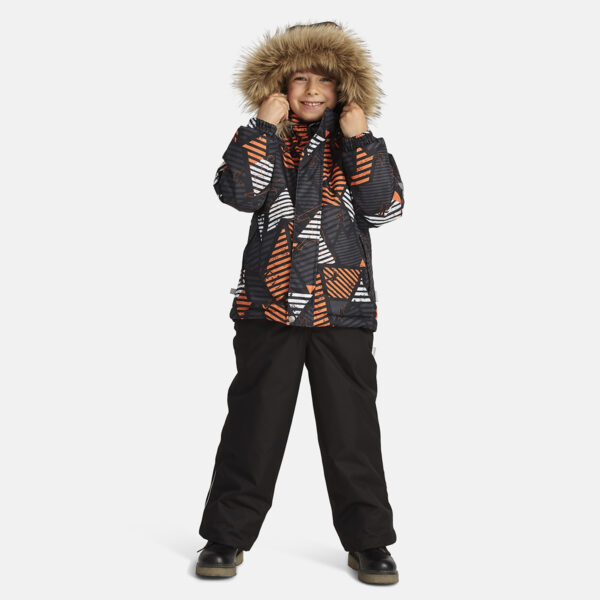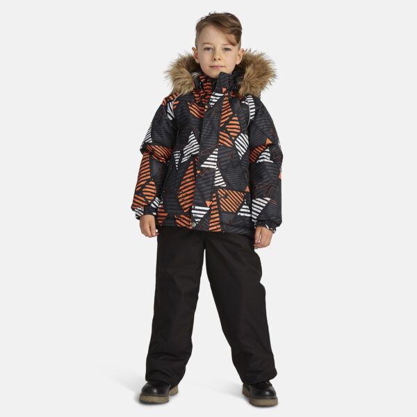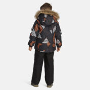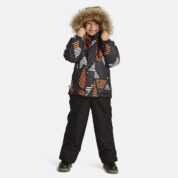 Bērnu jakas un bikšu komplekts. Ūdens un vēja necaurlaidīgs, gaisu caurlaidīgs virsējais audums. Jakai un biksēm ir mīksta odere. Piedurkņu un muguras daļā iestrādāta gumijas apdare. Noņemamā kapuce pie apkakles stiprināma ar velkro aizdari. Kapucei mākslīgās kažokādas malai. Biksēm ir augstais viduklis un regulējamas elastīgās lences. Jostas daļā iestrādāts gumijas paliktnis. Staras aizdarāmas ar stoperi. Ūdens necaurlaidīgi līmēti izšuvumi. Biksēm trūkst iekšējais staru apšuvums. Kā jakai, tā arī biksēm ir atstarojošas detaļas.