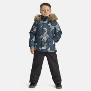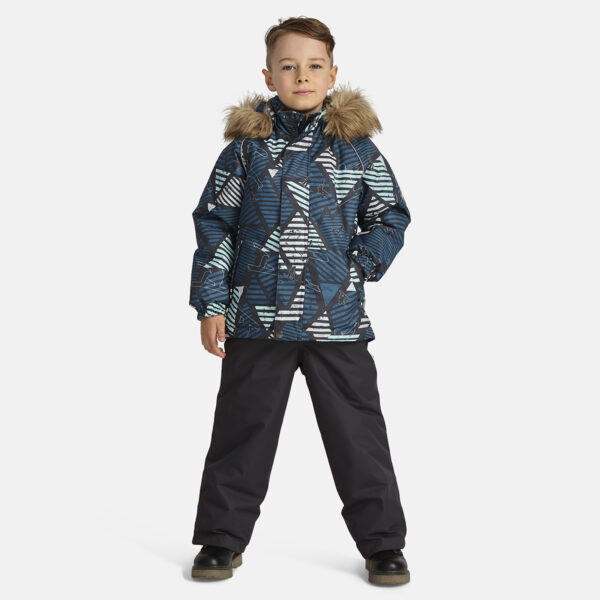 Bērnu jakas un bikšu komplekts. Ūdens un vēja necaurlaidīgs, gaisu caurlaidīgs virsējais audums. Jakai un biksēm ir mīksta odere. Piedurkņu un muguras daļā iestrādāta gumijas apdare. Noņemamā kapuce pie apkakles stiprināma ar velkro aizdari. Kapucei mākslīgās kažokādas malai. Biksēm ir augstais viduklis un regulējamas elastīgās lences. Jostas daļā iestrādāts gumijas paliktnis. Staras aizdarāmas ar stoperi. Ūdens necaurlaidīgi līmēti izšuvumi. Biksēm trūkst iekšējais staru apšuvums. Kā jakai, tā arī biksēm ir atstarojošas detaļas.