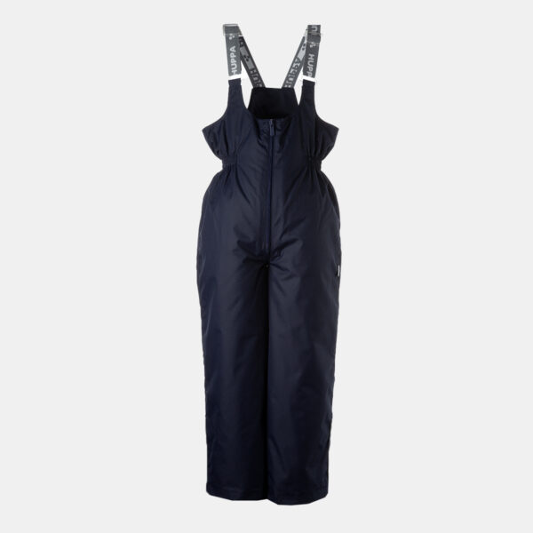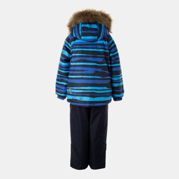 Vaikiškas striukės ir kelnių komplektas. Neperšlampamas ir neperpučiamas, orui laidus viršutinis audinys. Striukės ir kelnių vidinė pusė iš minkšto pamušalinio audinio. Rankovių apačioje ir ant juosmens įsiūta guminė juostelė. Nuimamas gobtuvas prie apykaklės prisegamas kibiu lipduku. Gobtuvas apsiūtas dirbiniu kailiu. Kelnės aukštesniu liemeniu ir turi reguliuojamas elastines petnešas. Juosmenyje įsiūta guminė juostelė. Klešnių apačioje įsiūta guminė juostelė su fiksatoriais. Vandeniui atsparios klijuotos siūlės. Kelnėse nėra klešnių vidinės siūlės. Ant striukės ir kelnių šviesą atspindinčios detalės.