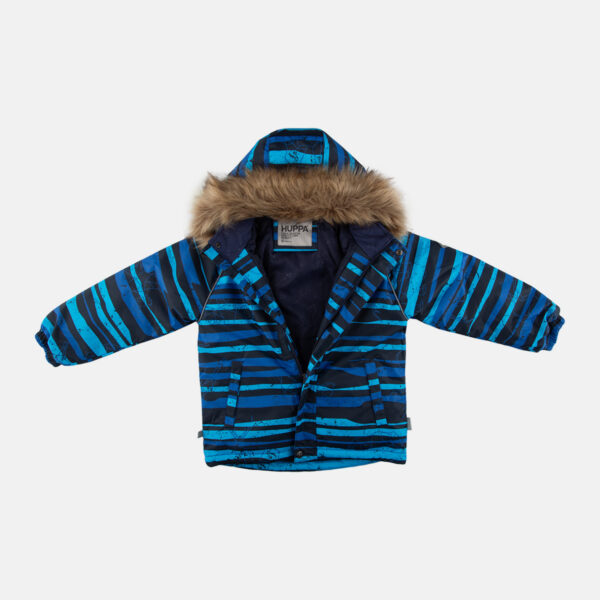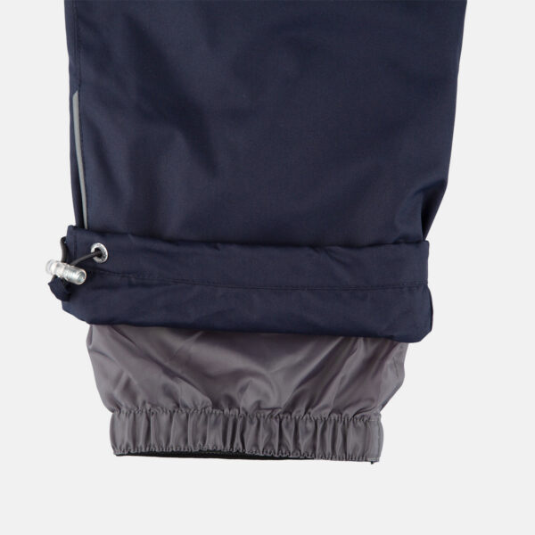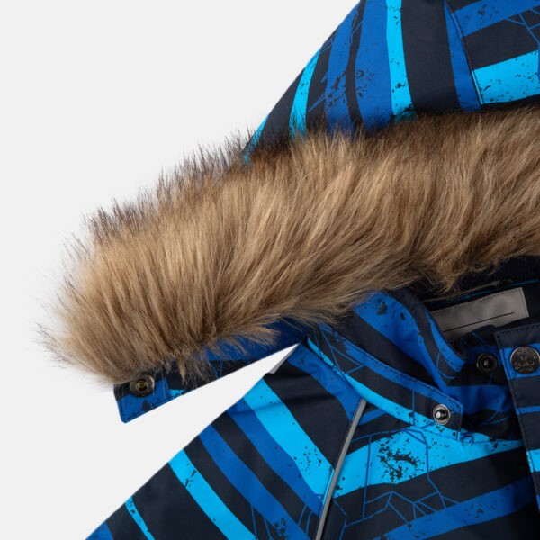 Children’s jacket and pants set. Waterproof, windproof and breathable fabric. Soft lining on the inside of the jacket and pants. Integrated elastic band at sleeve ends and on the waist. Removable snap-on hood. Faux fur trim on hood. The bib-pants have elastic adjustable suspenders. Integrated elastic band on waist. Drawstring tunnel with stoppers at leg ends. Waterproof taped seams. The pants have no inner leg seam. Reflective details on both jacket and pants.