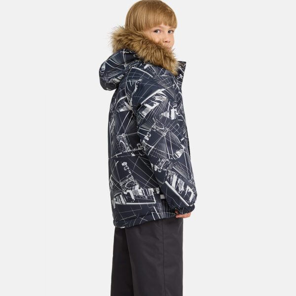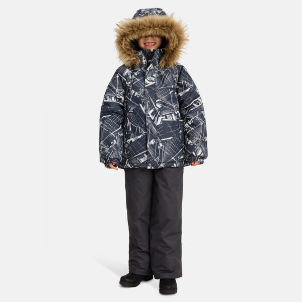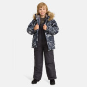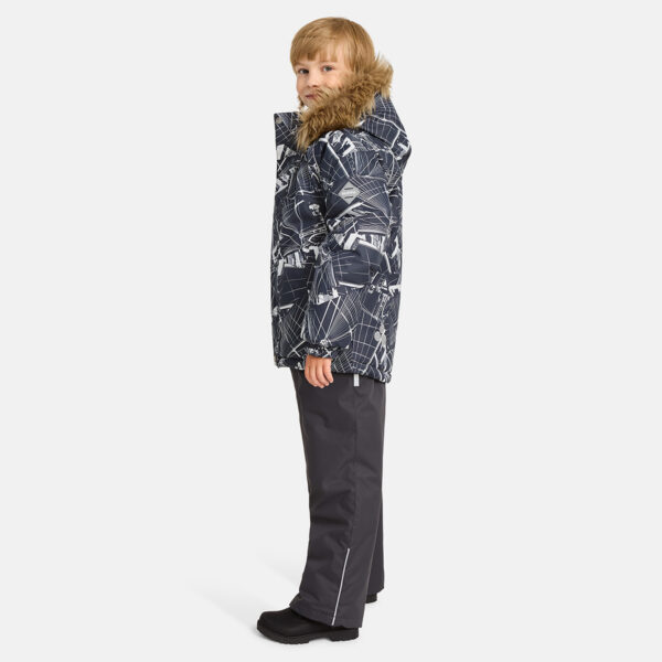 Children’s jacket and pants set. Waterproof, windproof and breathable fabric. Soft lining on the inside of the jacket and pants. Integrated elastic band at sleeve ends and on the waist. Removable snap-on hood. Faux fur trim on hood. The bib-pants have elastic adjustable suspenders. Integrated elastic band on waist. Drawstring tunnel with stoppers at leg ends. Waterproof taped seams. The pants have no inner leg seam. Reflective details on both jacket and pants.
