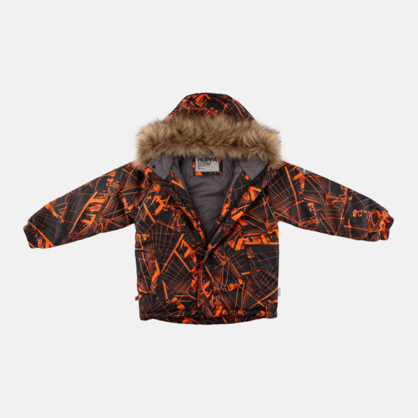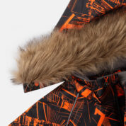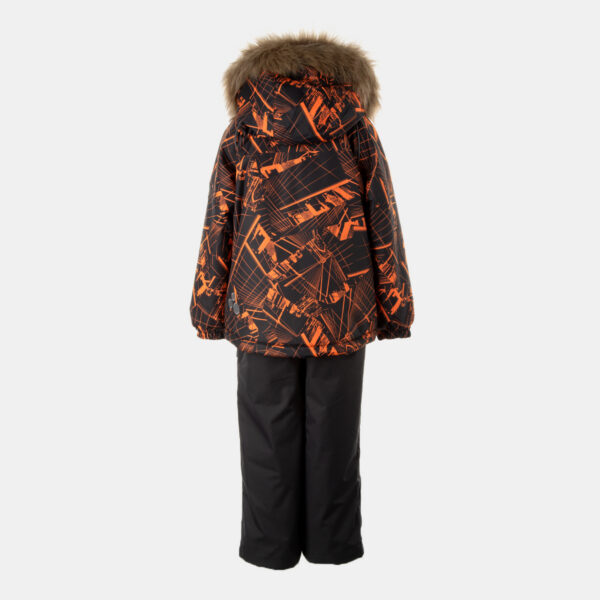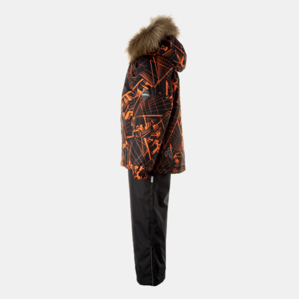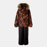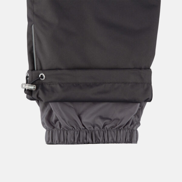 Children’s jacket and pants set. Waterproof, windproof and breathable fabric. Soft lining on the inside of the jacket and pants. Integrated elastic band at sleeve ends and on the waist. Removable snap-on hood. Faux fur trim on hood. The bib-pants have elastic adjustable suspenders. Integrated elastic band on waist. Drawstring tunnel with stoppers at leg ends. Waterproof taped seams. The pants have no inner leg seam. Reflective details on both jacket and pants.