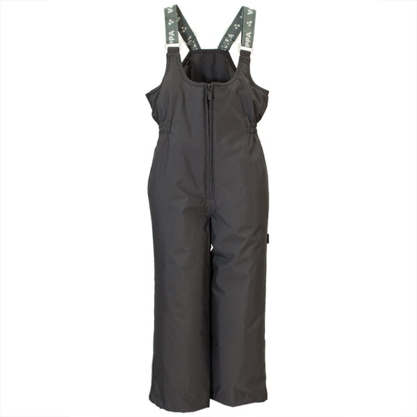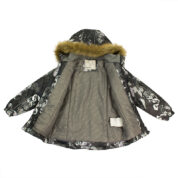 Bērnu jakas un bikšu komplekts. Ūdens un vēja necaurlaidīgs, gaisu caurlaidīgs virsējais audums. Jakai un biksēm ir mīksta odere. Piedurkņu un muguras daļā iestrādāta gumijas apdare. Noņemamā kapuce pie apkakles stiprināma ar velkro aizdari. Kapucei mākslīgās kažokādas malai. Biksēm ir augstais viduklis un regulējamas elastīgās lences. Jostas daļā iestrādāts gumijas paliktnis. Staras aizdarāmas ar stoperi. Ūdens necaurlaidīgi līmēti izšuvumi. Biksēm trūkst iekšējais staru apšuvums. Kā jakai, tā arī biksēm ir atstarojošas detaļas.
