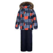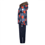 Bērnu jakas un bikšu komplekts. Ūdens un vēja necaurlaidīgs, gaisu caurlaidīgs virsējais audums. Jakai un biksēm ir mīksta odere. Piedurkņu un muguras daļā iestrādāta gumijas apdare. Noņemamā kapuce pie apkakles stiprināma ar velkro aizdari. Kapucei mākslīgās kažokādas malai. Biksēm ir augstais viduklis un regulējamas elastīgās lences. Jostas daļā iestrādāts gumijas paliktnis. Staras aizdarāmas ar stoperi. Ūdens necaurlaidīgi līmēti izšuvumi. Biksēm trūkst iekšējais staru apšuvums. Kā jakai, tā arī biksēm ir atstarojošas detaļas.