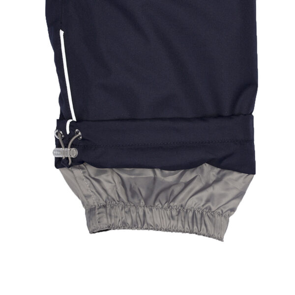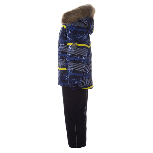 Children’s jacket and pants set. Waterproof, windproof and breathable fabric. Soft lining on the inside of the jacket and pants. Integrated elastic band at sleeve ends and on the waist. Removable snap-on hood. Faux fur trim on hood. The bib-pants have elastic adjustable suspenders. Integrated elastic band on waist. Drawstring tunnel with stoppers at leg ends. Waterproof taped seams. The pants have no inner leg seam. Reflective details on both jacket and pants.