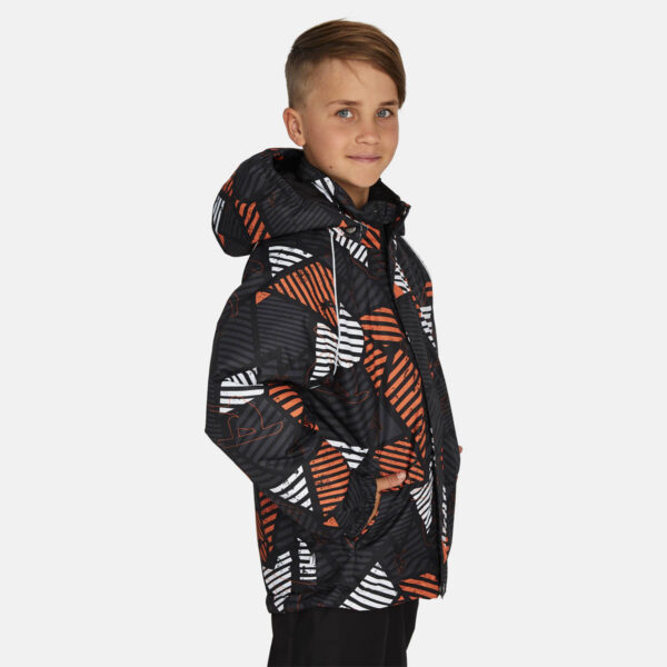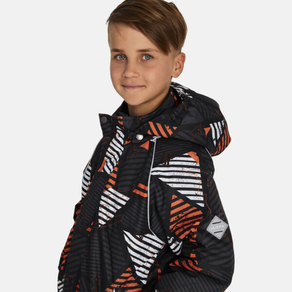 Children’s jacket and pants set Waterproof, windproof and breathable fabric. Soft lining on the inside of the jacket and pants. Integrated elastic band at sleeve ends and around hood. Removable snap-on hood. The bib-pants have elastic adjustable suspenders. Integrated elastic band on waist. Drawstring tunnel with stoppers at leg ends. Waterproof taped seams. The pants have no inner leg seam. Reflective details on both jacket and pants.