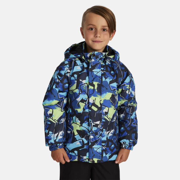 Bērnu jakas un bikšu komplekts. Ūdens un vēja necaurlaidīgs, gaisu caurlaidīgs virsējais audums. Jakai un biksēm ir mīksta odere. Piedurkņu, un kapuces malā iestrādāta gumijas apdare. Noņemamā kapuce pie apkakles stiprināma ar velkro aizdari. Kapucei mākslīgās kažokādas malai. Biksēm ir augstais viduklis un regulējamas elastīgās lences. Jostas daļā iestrādāts gumijas paliktnis. Staras aizdarāmas ar stoperi. Ūdens necaurlaidīgi līmēti izšuvumi. Biksēm trūkst iekšējais staru apšuvums. Kā jakai, tā arī biksēm ir atstarojošas detaļas.