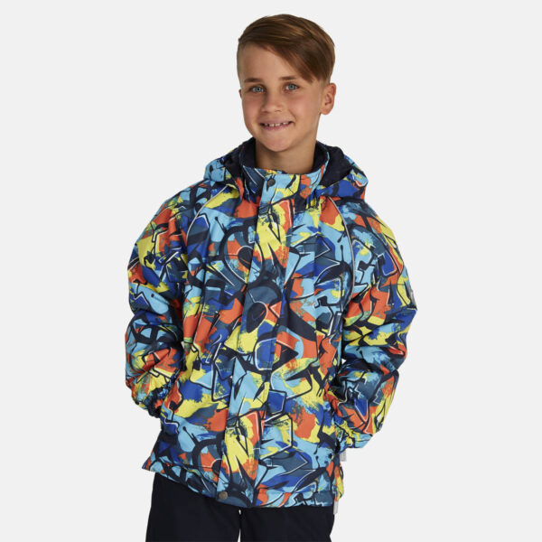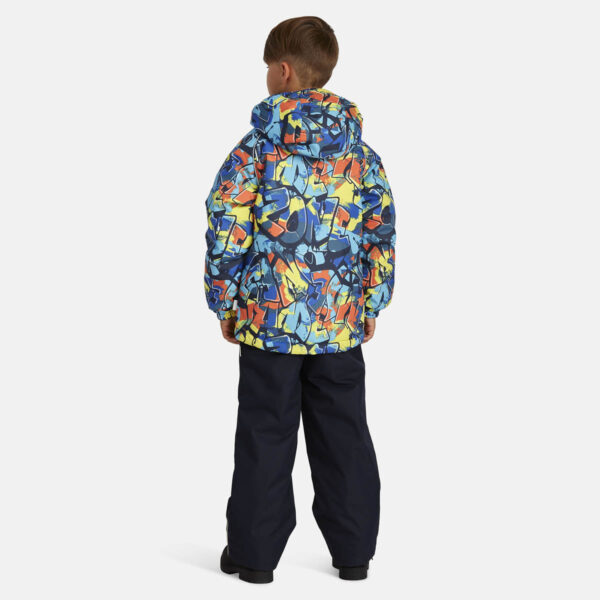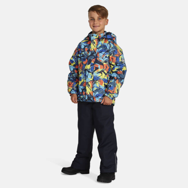Bērnu jakas un bikšu komplekts. Ūdens un vēja necaurlaidīgs, gaisu caurlaidīgs virsējais audums. Jakai un biksēm ir mīksta odere. Piedurkņu, un kapuces malā iestrādāta gumijas apdare. Noņemamā kapuce pie apkakles stiprināma ar velkro aizdari. Kapucei mākslīgās kažokādas malai. Biksēm ir augstais viduklis un regulējamas elastīgās lences. Jostas daļā iestrādāts gumijas paliktnis. Staras aizdarāmas ar stoperi. Ūdens necaurlaidīgi līmēti izšuvumi. Biksēm trūkst iekšējais staru apšuvums. Kā jakai, tā arī biksēm ir atstarojošas detaļas.