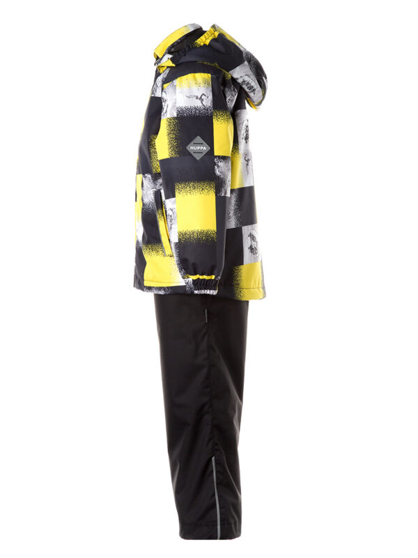 Children´s transition season jacket and pants set. Water- and windproof, breathable outer fabric. The inside of the jacket and trousers is made of soft lining fabric. Rubber band incorporated in the sleeve ends and the edge of the hood. The removable hood attaches to the collar with press studs. The trousers have a higher waist and adjustable elastic braces. incorporated rubber waistband. Rubber band tunnel with stoppers at the ends of the legs. Waterproof taped seat seam. The pants have no inseam on the leg. Both jackets and trousers have reflective details.