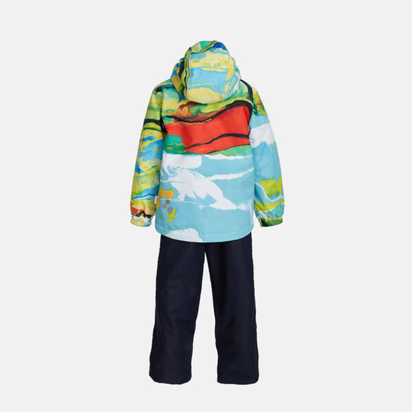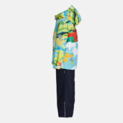 Children´s transition season jacket and pants set. Water- and windproof, breathable outer fabric. The inside of the jacket and trousers is made of soft lining fabric. Rubber band incorporated in the sleeve ends and the edge of the hood. The removable hood attaches to the collar with press studs. The trousers have a higher waist and adjustable elastic braces. incorporated rubber waistband. Rubber band tunnel with stoppers at the ends of the legs. Waterproof taped seat seam. The pants have no inseam on the leg. Both jackets and trousers have reflective details.