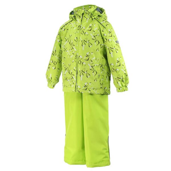 Children´s transition season jacket and pants set. Water- and windproof, breathable outer fabric. The inside of the jacket and trousers is made of soft lining fabric. Rubber band incorporated in the sleeve ends and the edge of the hood. The removable hood attaches to the collar with press studs. The trousers have a higher waist and adjustable elastic braces. incorporated rubber waistband. Rubber band tunnel with stoppers at the ends of the legs. Waterproof taped seat seam. The pants have no inseam on the leg. Both jackets and trousers have reflective details.