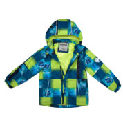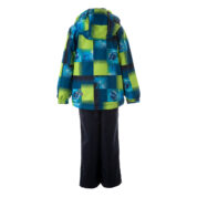 Children´s transition season jacket and pants set. Water- and windproof, breathable outer fabric. The inside of the jacket and trousers is made of soft lining fabric. Rubber band incorporated in the sleeve ends and the edge of the hood. The removable hood attaches to the collar with press studs. The trousers have a higher waist and adjustable elastic braces. incorporated rubber waistband. Rubber band tunnel with stoppers at the ends of the legs. Waterproof taped seat seam. The pants have no inseam on the leg. Both jackets and trousers have reflective details.