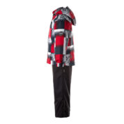 Children´s transition season jacket and pants set. Water- and windproof, breathable outer fabric. The inside of the jacket and trousers is made of soft lining fabric. Rubber band incorporated in the sleeve ends and the edge of the hood. The removable hood attaches to the collar with press studs. The trousers have a higher waist and adjustable elastic braces. incorporated rubber waistband. Rubber band tunnel with stoppers at the ends of the legs. Waterproof taped seat seam. The pants have no inseam on the leg. Both jackets and trousers have reflective details.