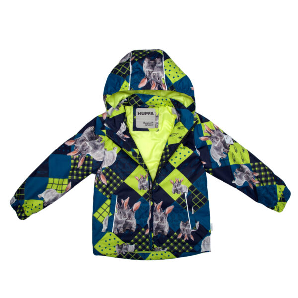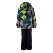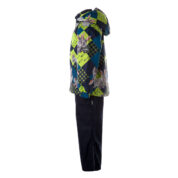 Children´s transition season jacket and pants set. Water- and windproof, breathable outer fabric. The inside of the jacket and trousers is made of soft lining fabric. Rubber band incorporated in the sleeve ends and the edge of the hood. The removable hood attaches to the collar with press studs. The trousers have a higher waist and adjustable elastic braces. incorporated rubber waistband. Rubber band tunnel with stoppers at the ends of the legs. Waterproof taped seat seam. The pants have no inseam on the leg. Both jackets and trousers have reflective details.