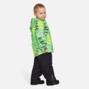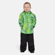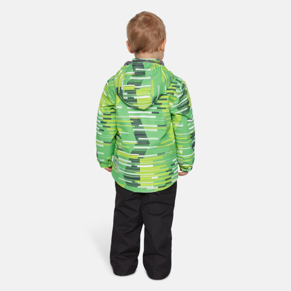 Bērnu starpsezonas jakas un bikšu komplekts. Ūdens- un vēja izturīgs, elpojošs virsaudums. Jakas un bikšu iekšpusē ir mīksts oderaudums. Piedurkņu galos un kapuces malā iestrādāta gumijas lente. Noņemamā kapuce pie apkakles nostiprināma ar spiedpogām. Biksēm ir augstāka jostasvieta un regulējamas, elastīgas lences. Jostasvietā iestrādāta gumijas lente. Staru galos gumijas auklas tunelis ar iestrādātām atdurēm. Ūdensnoturīga, stepēta sēžas šuve. Biksēm nav staras iekšējās šuves. Gan jakai, gan biksēm ir atstarojošas detaļas.