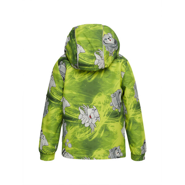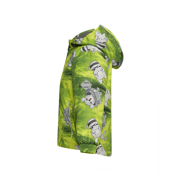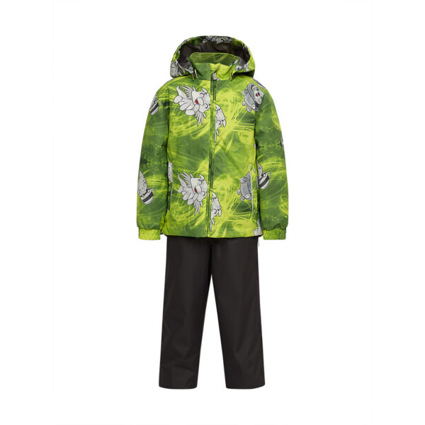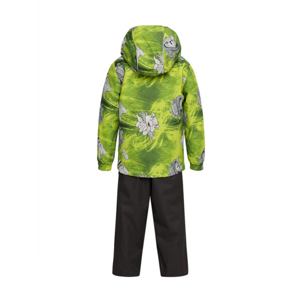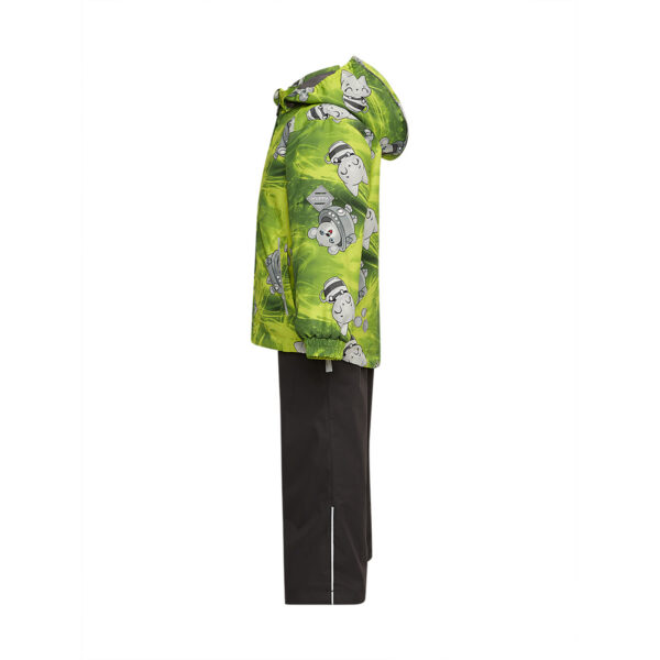 Children´s transition season jacket and pants set. Water- and windproof, breathable outer fabric. The inside of the jacket and trousers is made of soft lining fabric. Rubber band incorporated in the sleeve ends and the edge of the hood. The removable hood attaches to the collar with press studs. The trousers have a higher waist and adjustable elastic braces. incorporated rubber waistband. Rubber band tunnel with stoppers at the ends of the legs. Waterproof taped seat seam. The pants have no inseam on the leg. Both jackets and trousers have reflective details.