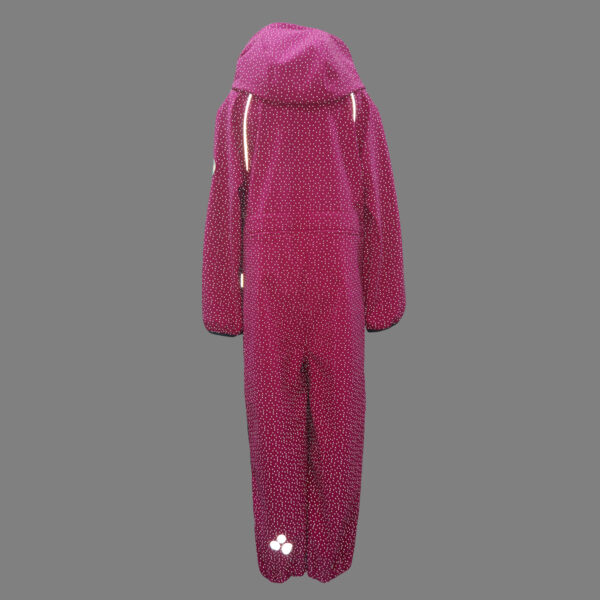 Vaikiškas vėją sulaikantis kombinezonas iš Softshell audinio. Viršutinėje pusėje taškinis šviesą atspindintis raštas. Kombinezono vidinė pusė yra minkšta. Gaubtuvo krašte ir klešnių apačioje įsiūta guminė juostelė. Nuimamas gobtuvas prie apykaklės prisegamas kibiu lipduku. Kelių antsiuvai iš tvirto audinio. Nugaroje į juosmenį įsiūta guminė juostelė su skylutėmis sagoms. Klešnių apačioje silikoninės gumelės batams.