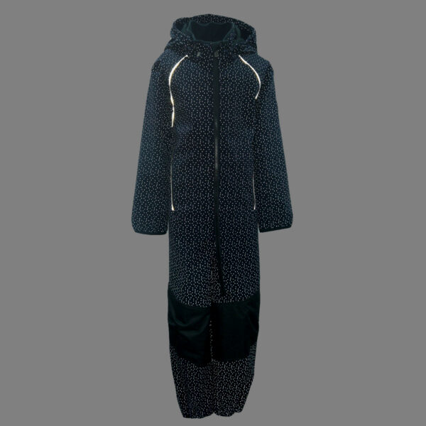 Children’s windproof Softshell overall. Dotted reflective print all over. Brushed soft on the inside. Integrated elastic band around the hood and at leg ends. Removable snap-on hood. Durable fabric on knees. Buttonhole-adjustable waist element on the back. Silicone foot straps.