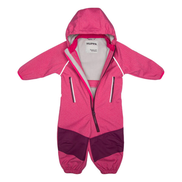 Children’s windproof Softshell overall. Dotted reflective print all over. Brushed soft on the inside. Integrated elastic band around the hood and at leg ends. Removable snap-on hood. Durable fabric on knees. Buttonhole-adjustable waist element on the back. Silicone foot straps.