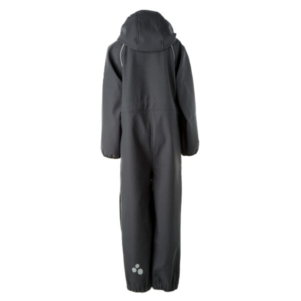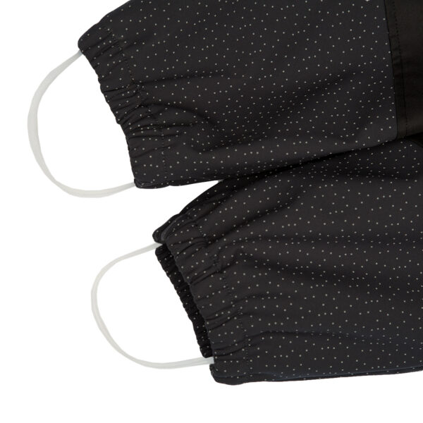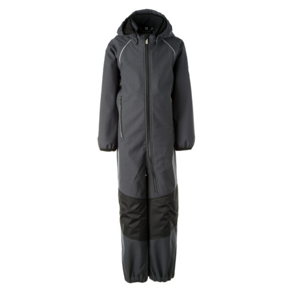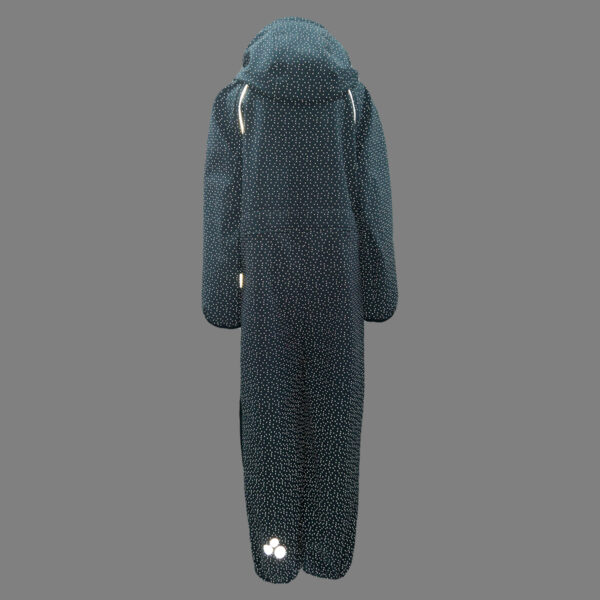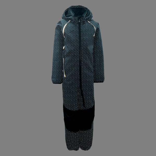 Children’s windproof Softshell overall. Dotted reflective print all over. Brushed soft on the inside. Integrated elastic band around the hood and at leg ends. Removable snap-on hood. Durable fabric on knees. Buttonhole-adjustable waist element on the back. Silicone foot straps.