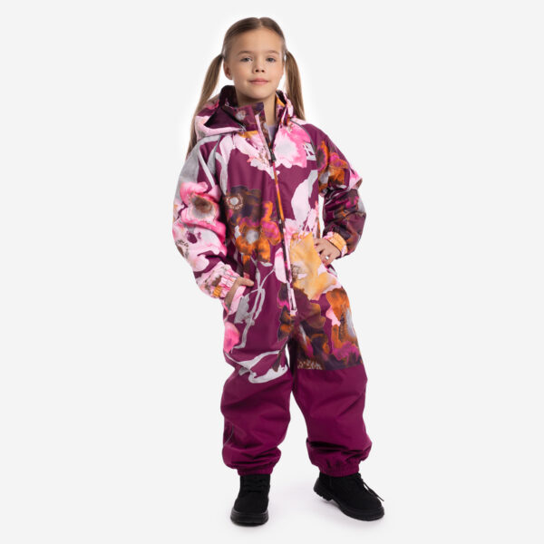 Insulated (40 g) water- and windproof overall for kids, suitable for spring and autumn. The top layer of the overall is made of a breathable material. It has sewn-in elastic bands on the sleeves, ankles and hood. The detachable hood can be attached to the collar with snap fasteners. The overall has a sewn-in buttonhole elastic on the waistline and waterproof, taped seams. The set includes elastic foot straps. It is decorated with reflective details.