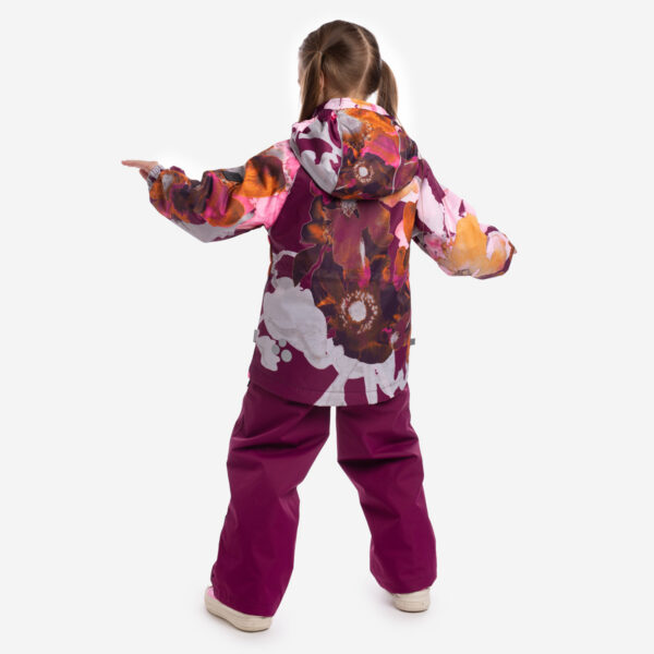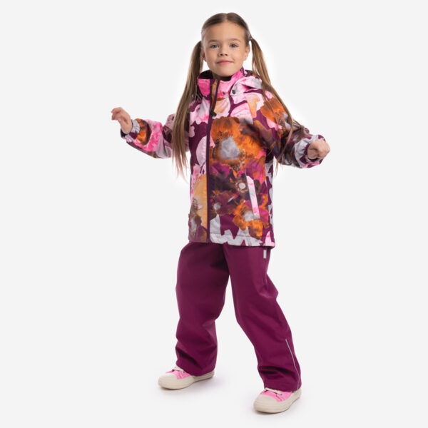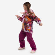Children´s transition season jacket and pants set. Water- and windproof, breathable outer fabric. The inside of the jacket and trousers is made of soft lining fabric. Rubber band incorporated in the sleeve ends, hood edge, and back waist. The removable hood attaches to the collar with press studs. The trousers have a higher waist and adjustable elastic braces. incorporated rubber waistband. Waterproof taped seat seam. Both jackets and trousers have reflective details.