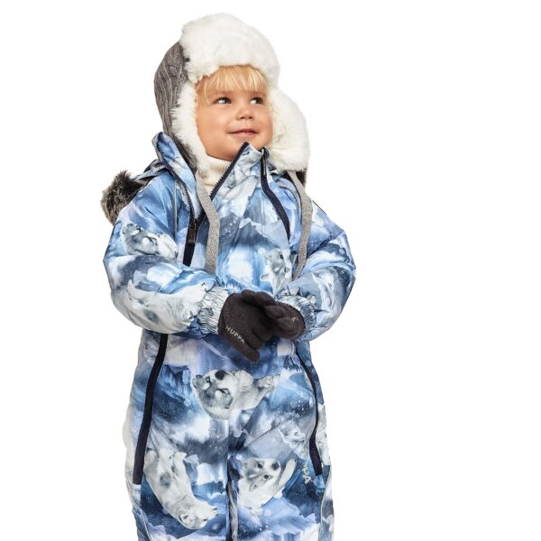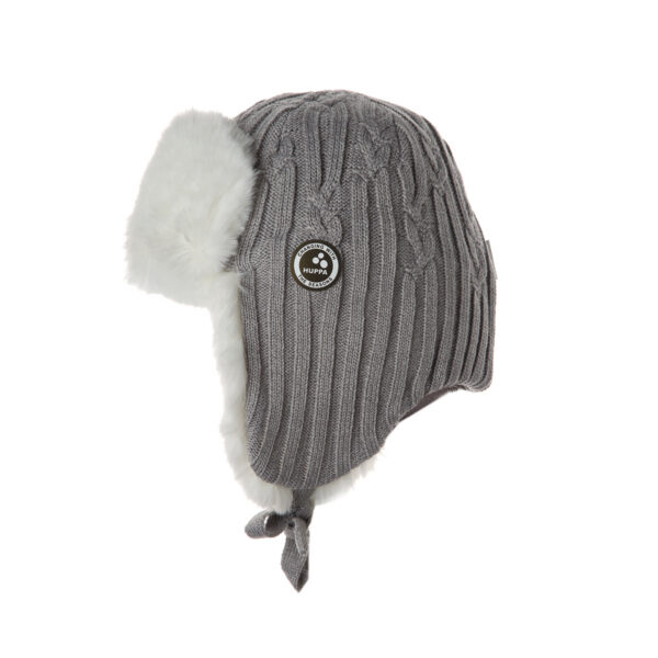 Children´s hat with lining, knitted from soft merino blend yarn. Inside of the hat made of cotton jersey. Imitation sheepskin lining on the front and ears. Reflective Huppa logo on the hat.