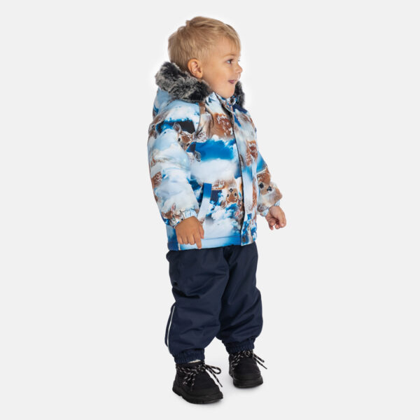 Children’s waterproof and windproof jacket. Breathable fabric. Soft mesh lining on the inside. Removable snap-on hood. Integrated elastic band at sleeve ends. Zipper covered with stud-press flap at front. Integrated pockets at front. Faux fur trim on hood. Reflective elements on fabric.