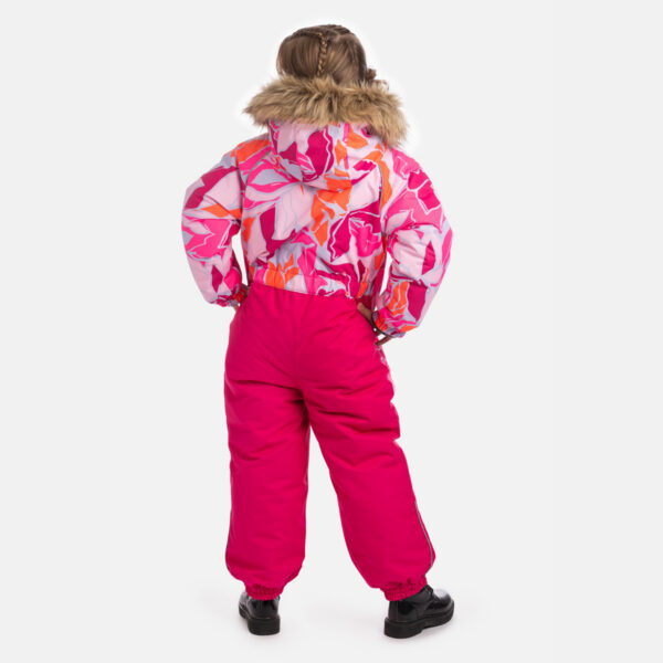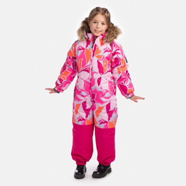 Children’s waterproof and windproof overall. Breathable fabric. Soft fabric on the inside. Integrated elastic band at sleeve and leg ends. Removable snap-on hood. Integrated zipper pocket at front. Waterproof taped seams. Elastic foot straps. Removable faux fur trim on hood. Reflective elements on fabric.