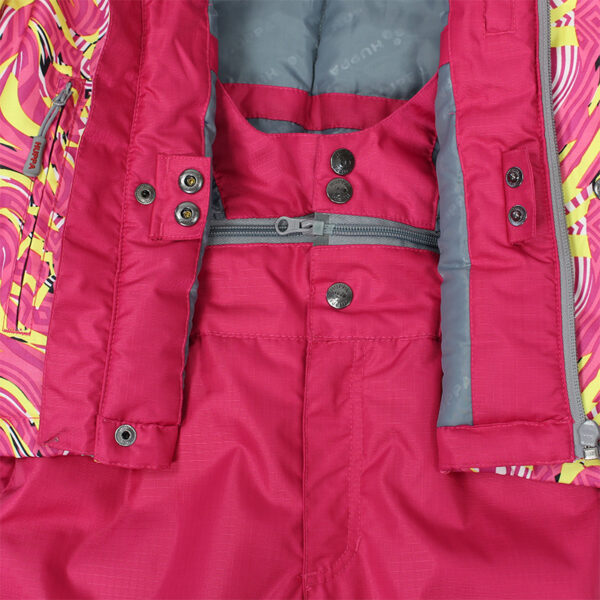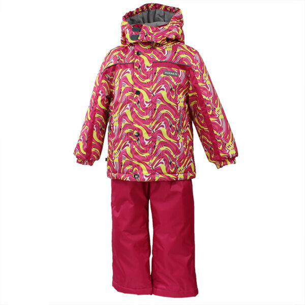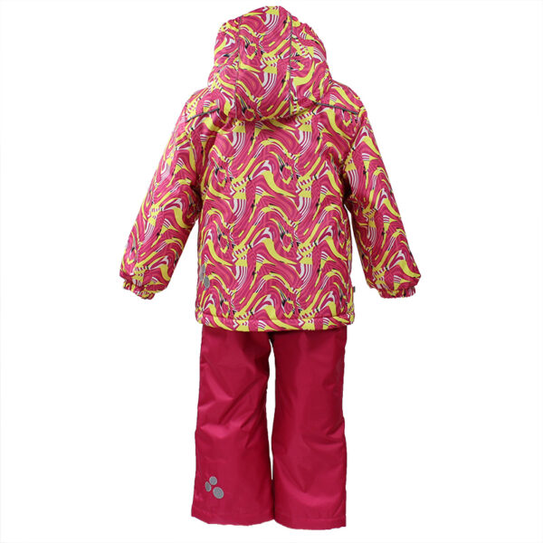 Children´s winter set. The set includes a 200g insulated taffeta-lined jacket and 100g insulated pants, which can be easily connected to each other with a zipper to create an overall. The jacket has an internal snow guard that can be fastened with snaps, a removable hood and pockets with zippers for storing your most valuables. The pants have removable suspenders and an internal snow guard on the legs. The set is enhanced with plenty of reflective details in the cutouts and at the bottom of the pants. The shoulder seams, seat seam and side seams are taped to be waterproof.