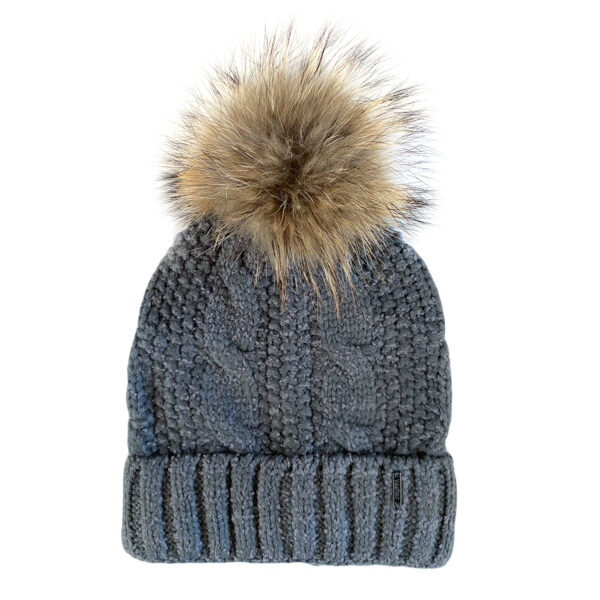 Adults’ soft yarn knit hat. Natural fur pompom.