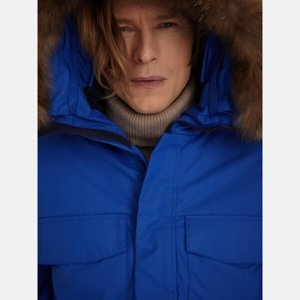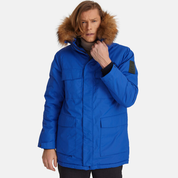 Men´s winter parka with 200g insulation. The outer fabric is wind and water resistant, and the taped seams keep you warm and dry. The hood has a removable fur, and the top pockets are closed with snaps and the side pockets with zippers. The reflective details added to the parka ensure visibility in the dark.