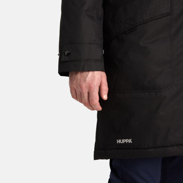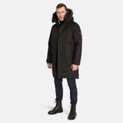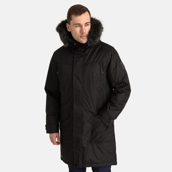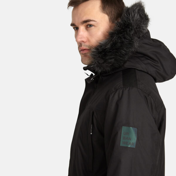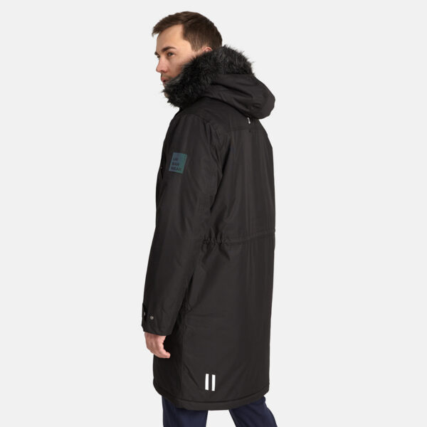Men´s waterproof and windproof winter coat. Breathable outer fabric. Soft inner fabric. Faux sheepskin lining on the upper back and inside the hood. Adjustable hood. Ribbed cuffs at the sleeve ends. Adjustable sleeve ends. Two-way zipper covered with a press stud at the front. Front pockets with zippers covered by a flap with a magnetic closure. Elastic cord tunnel with stoppers at the waist. Waterproof taped seams. Removable faux fur trim on the hood. Reflective details on the outer fabric.