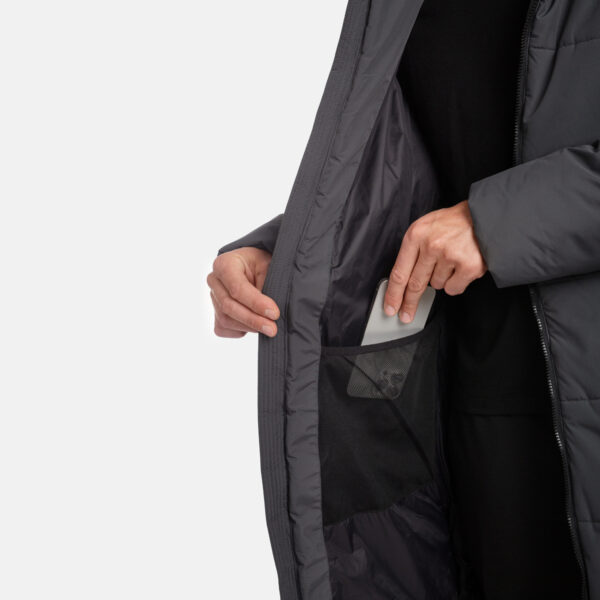 Men’s water- and windproof winter coat with 300 g insulation. The breathable outer fabric is made from recycled fibres. Adjustable hood. Elastic cuffs on sleeves. Front two-way zipper. Zipper pockets. Reflective detailing on outer fabric.