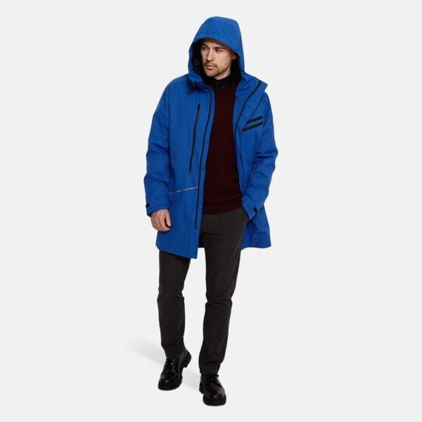 Men’s waterproof and windproof spring and autumn parka Breathable fabric Soft lining on the inside Adjustable hood and sleeve ends Ribbed cuffs at sleeve ends Integrated breast pockets with waterproof zippers Waterproof taped seams Reflective elements on fabric