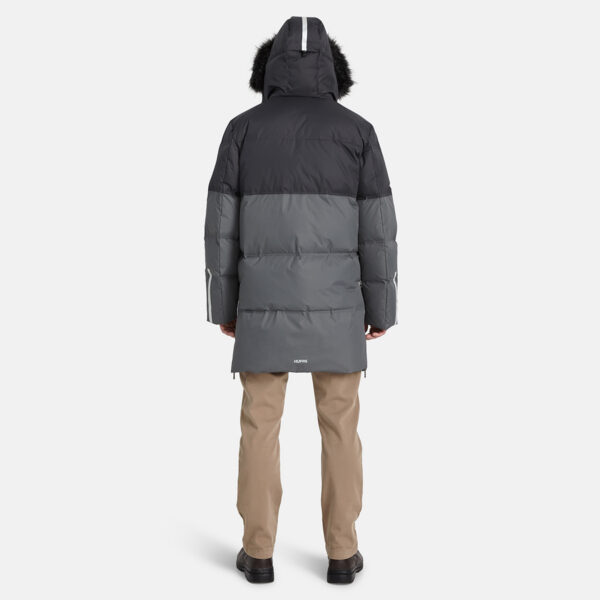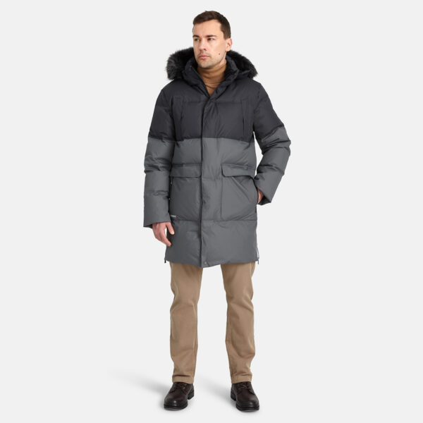 Men’s water- and windproof down coat. Breathable outer fabric. Soft lining fabric inside the coat. Sheepskin imitation lining on the upper back. Filled with feathers and down feathers. Ribbed cuffs on sleeves. Front two-way zipper with a snap button placket. Detachable faux fur trim on hood. Reflective detailing has been added to the outer fabric of the coat for better visibility in the dark.