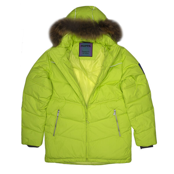 Men’s waterproof and windproof down jacket. Breathable fabric. Soft mesh lining on the inside. Down feathers and feathers for filling. Removable snap-on hood. Ribbed cuffs at sleeve ends. With zipper. Integrated zipper pockets at front. Removable natural fur trim on hood. Reflective elements on fabric.