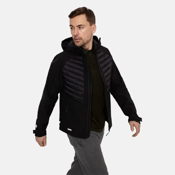 Vīriešu ūdens un vēja necaurlaidīga hibrīdjaka. Jakas kapuce, piedurknes un apakšdaļa ir no mīkstā Softshell auduma. Materiāla virspusei ir viegls spīdums, tā pildījumā izmantots inovatīvs pārstrādāts materiāls, kas imitē dūnu pildījuma īpašības. Materiāls ir silts, ātri žūstošs un mazgājot nesaveļas. Jakai ir mīksta odere. Regulējamas piedurknes. Rāvējslēdzēja aizdare. Jakas priekšpusē aizdarāmas kabatas. Uz jakas ir atstarojošas detaļas.