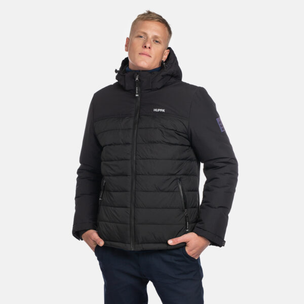 Men´s water- and windproof winter jacket with 200 g insulation. The jacket is made from recycled fibre materials. Breathable outer fabric. Soft lining fabric inside the jacket. Adjustable hood and sleeve cuffs. Detachable hood fastens to the collar with a zip. Ribbed cuffs on sleeves. Waterproof zipper front and pockets. Rubber cord tunnel with stoppers at the bottom. Reflective detailing on outer fabric.