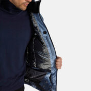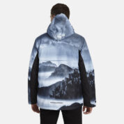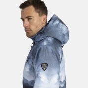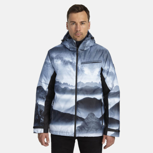 Men’s waterproof and windproof jacket Breathable fabric Soft mesh lining on the inside Powder skirt Integrated adjustable elastic band around the hood and on the back Waterproof zipper at front, zippered pockets Adjustable sleeve ends Cuffs with thumb holes at sleeve ends Waterproof taped seams Reflective elements on fabric