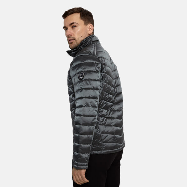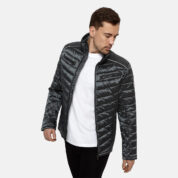 Men´s quilted jacket. Windproof slightly glossy top fabric. The jacket is filled with innovative recycled material imitating the properties of feather fill. The material is warm, dries quickly and does not clump after washing. A great to natural feather fill.