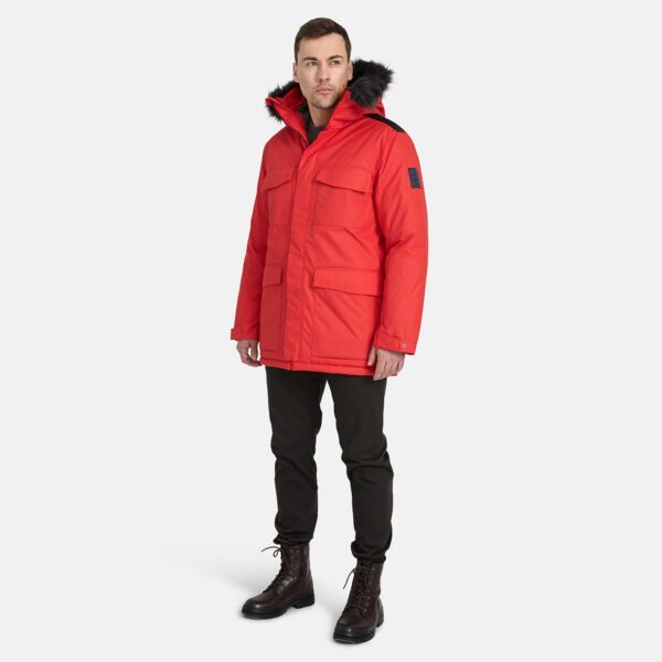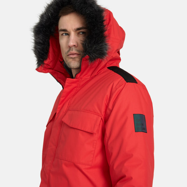 Men´s waterproof and windproof winter paka with 300g of insulation. Breathable outer fabric. Soft lining inside the parka. Adjustable hood. Ribbed cuffs at the sleeve ends. Adjustable sleeve ends. Two-way zipper covered with a flap at the front. Magnetic-fastened pockets and front flap. Elastic cord tunnel with integrated stoppers at the bottom hem. Removable faux fur trim on the hood. Reflective details on the outer fabric.
