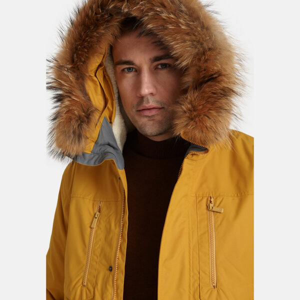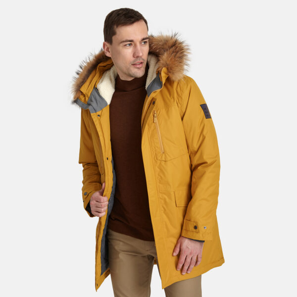 Men’s waterproof and windproof winter parka. Breathable fabric. Soft fabric on the inside. Faux sheepskin lining at the top of the back and inside the hood. Adjustable hood. Ribbed cuffs at sleeve ends. Adjustable sleeve ends. Two-way zipper covered with stud-press flap at front. Drawstring tunnel with stoppers on waist. Waterproof taped seams. Removable natural fur trim on hood. Reflective elements on fabric.