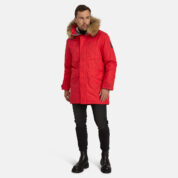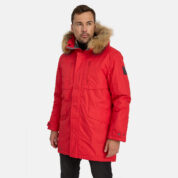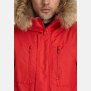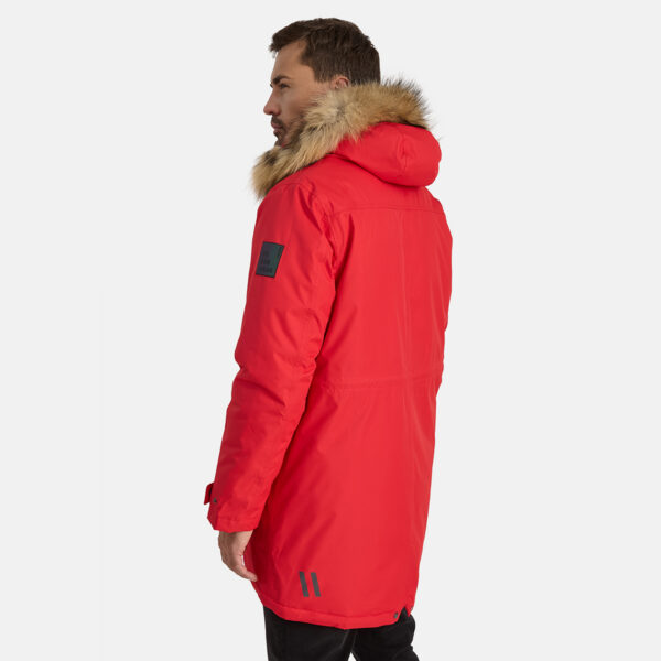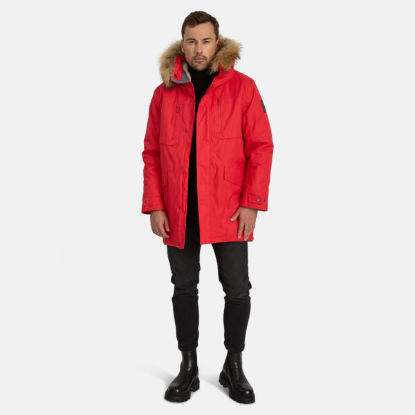 Men’s waterproof and windproof winter parka. Breathable fabric. Soft fabric on the inside. Faux sheepskin lining at the top of the back and inside the hood. Adjustable hood. Ribbed cuffs at sleeve ends. Adjustable sleeve ends. Two-way zipper covered with stud-press flap at front. Drawstring tunnel with stoppers on waist. Waterproof taped seams. Removable natural fur trim on hood. Reflective elements on fabric.
