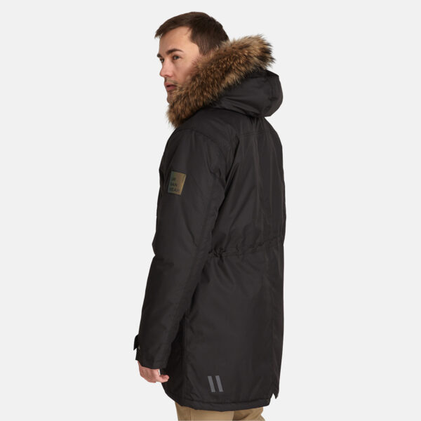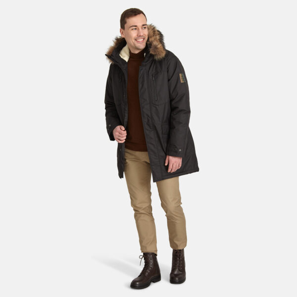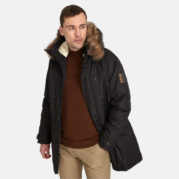 Vīriešu ūdens un vēja necaurlaidīgā ziemas jaka Gaisu caurlaidīgs virsējais audums Jakas odere no mīksta auduma Muguras augšdaļā un kapuces iekšējos sānos jērādas imitācijas odere Regulējama kapuce Rievota piedurkņu apdare Regulējamas piedurknes Priekšpusē apšūts dubultā virziena rāvējslēdzējs Vidukļa daļā rāvējslēdzējs ar stoperi Ūdens necaurlaidīgi līmēti izšuvumi Kapucei noņemama mākslīgās kažokādas mala Auduma virspusē atstarojošas detaļas