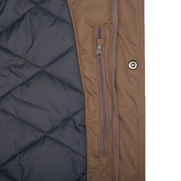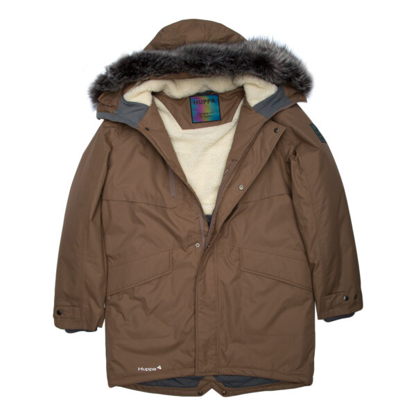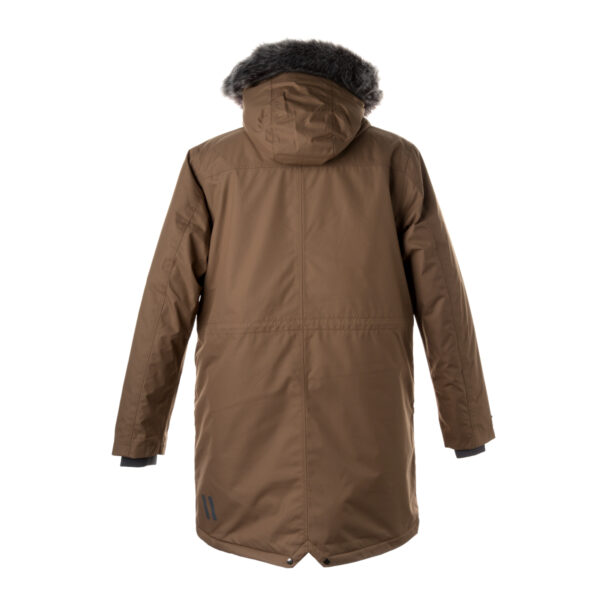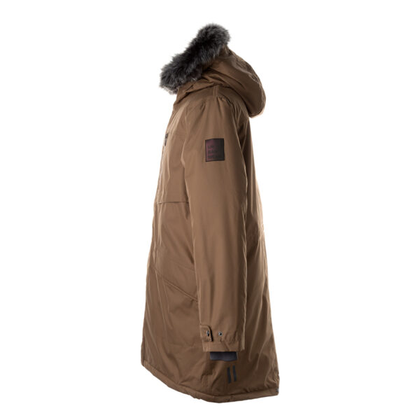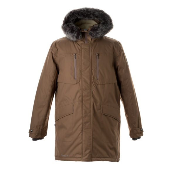 Men’s waterproof and windproof winter parka. Breathable fabric. Soft fabric on the inside. Faux sheepskin lining at the top of the back and inside the hood. Adjustable hood. Ribbed cuffs at sleeve ends. Adjustable sleeve ends. Two-way zipper covered with stud-press flap at front. Drawstring tunnel with stoppers on waist. Waterproof taped seams. Removable faux fur trim on hood. Reflective elements on fabric.