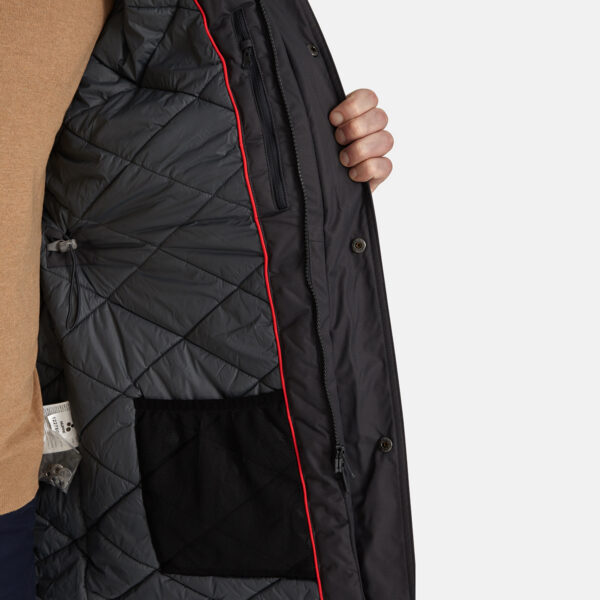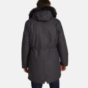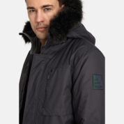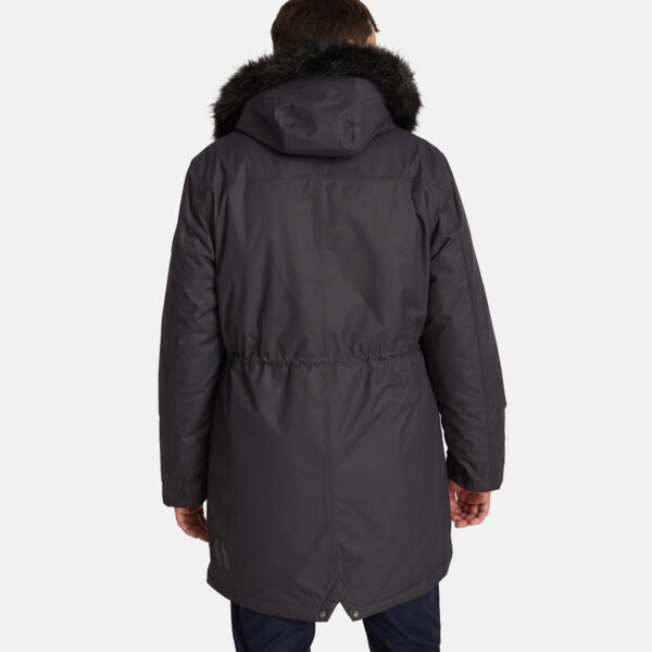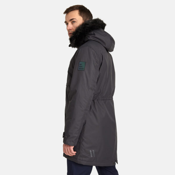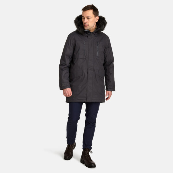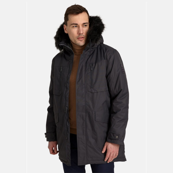 Men’s waterproof and windproof winter parka. Breathable fabric. Soft fabric on the inside. Faux sheepskin lining at the top of the back and inside the hood. Adjustable hood. Ribbed cuffs at sleeve ends. Adjustable sleeve ends. Two-way zipper covered with press button flap at front. Drawstring tunnel with stoppers on waist. Waterproof taped seams. Removable faux fur trim on hood. Reflective elements on fabric.