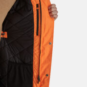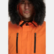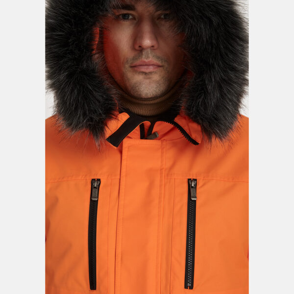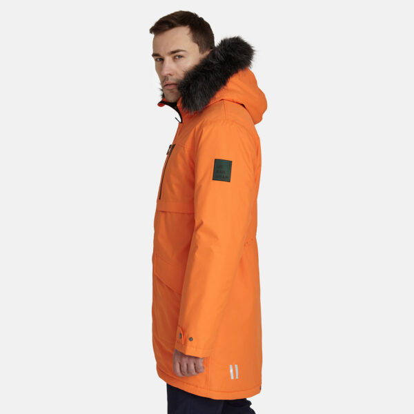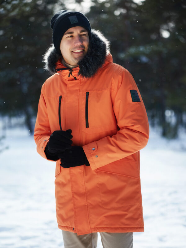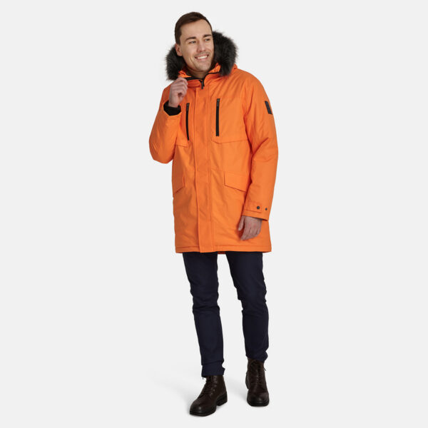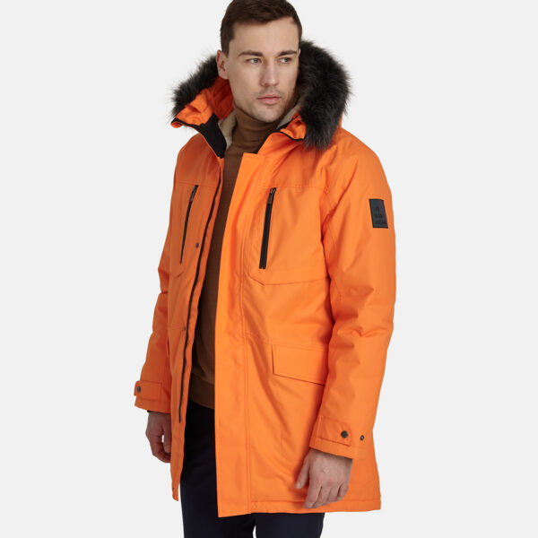 Men’s waterproof and windproof winter parka. Breathable fabric. Soft fabric on the inside. Faux sheepskin lining at the top of the back and inside the hood. Adjustable hood. Ribbed cuffs at sleeve ends. Adjustable sleeve ends. Two-way zipper covered with stud-press flap at front. Drawstring tunnel with stoppers on waist. Waterproof taped seams. Removable faux fur trim on hood. Reflective elements on fabric.