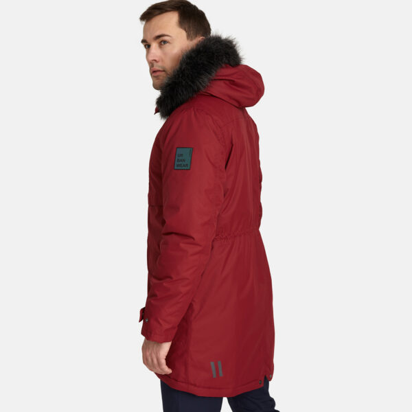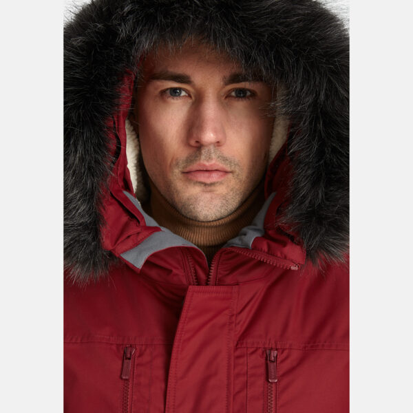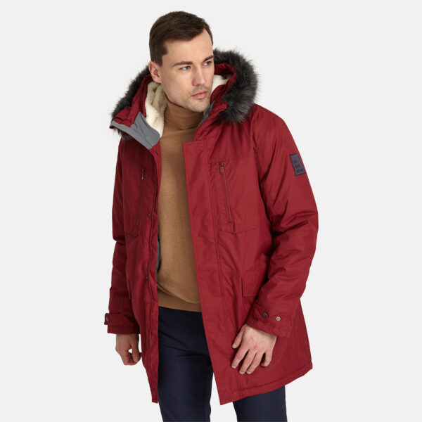 Men’s waterproof and windproof winter parka. Breathable fabric. Soft fabric on the inside. Faux sheepskin lining at the top of the back and inside the hood. Adjustable hood. Ribbed cuffs at sleeve ends. Adjustable sleeve ends. Two-way zipper covered with press button flap at front. Drawstring tunnel with stoppers on waist. Waterproof taped seams. Removable faux fur trim on hood. Reflective elements on fabric.