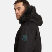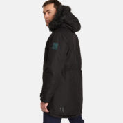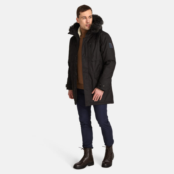 Men’s waterproof and windproof winter parka. Breathable fabric. Soft fabric on the inside. Faux sheepskin lining at the top of the back and inside the hood. Adjustable hood. Ribbed cuffs at sleeve ends. Adjustable sleeve ends. Two-way zipper covered with press button flap at front. Drawstring tunnel with stoppers on waist. Waterproof taped seams. Removable faux fur trim on hood. Reflective elements on fabric.